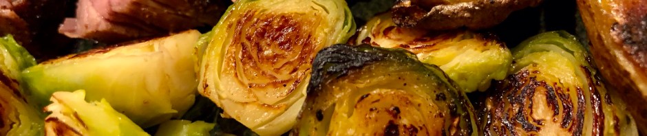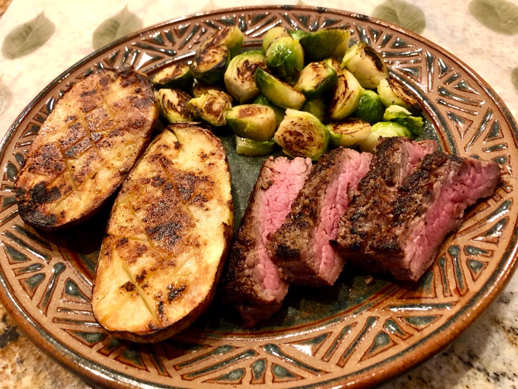 While he finished up grilling, I started the sprouts in a large covered pan with the cut sides facing down. I added about a cup of water, a quarter teaspoon of sugar, 2 teaspoons of butter, salt, and maybe two tablespoons of dry Marsala wine. These ingredients cooked covered until the sprouts were almost done and then I took off the lid and let the water evaporate. The sprouts then browned in the butter and sugar. They were super yummy.