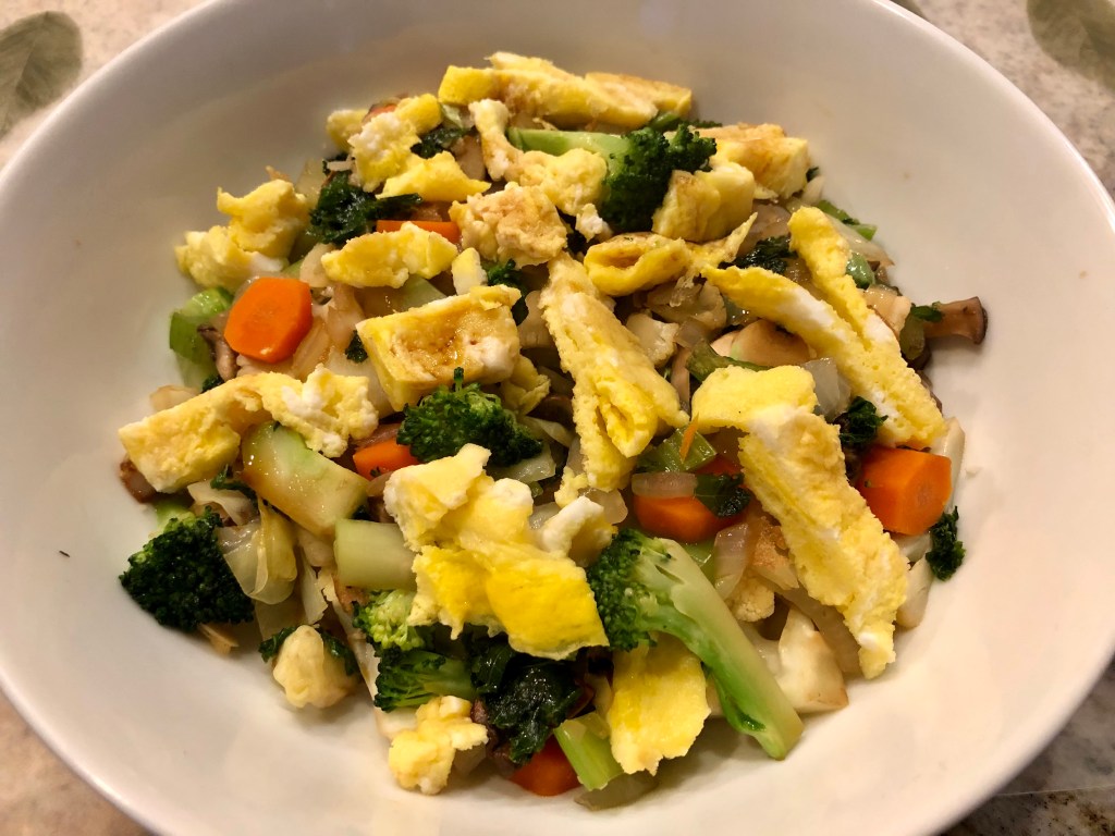 While John’s omelet dinner is truly a BFD, my BFDs have morphed into any dish that includes eggs. This week’s dish is an Asian inspired vegetable stir-fry with a sliced egg-only omelet on top and cauliflower rice underneath. I know me well enough to have learned that not eating enough for dinner will put me on the path of finding something else to eat around 10PM.