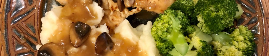 He was also in charge of the sauce. I had come up with an idea for a super easy way to make the sauce and he executed my vision perfectly. While I sauteed some mushrooms and shallot, John made a packet of McCormack chicken gravy. When the gravy thickened up (just add a cup of water and bring to a boil, boiling for one minute until thickened) he added 3 tablespoons of Marsala and boiled the mixture for a couple of minutes to let the alcohol burn off. We tasted it and decided it needed more Marsala and some acid. John put in another 3 tablespoons of Marsala and a squeeze of lemon. After another quick boil it was perfect! He added the sautéed mushrooms and shallot and, voila, our fancy sauce was ready to be ladled on to the chicken and mashed potatoes.
