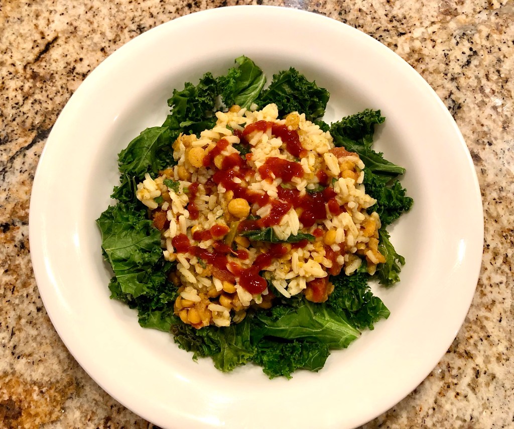 We made Chana dal (dried chickpea stew) on Friday and then had it for leftovers on Saturday. On Friday we ate it on top of raw kale and rice with a garnish of mango salsa, cilantro, and sriracha.