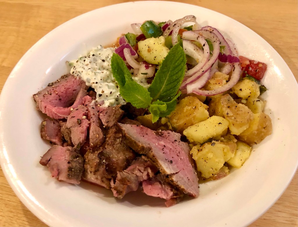 This is actually a plate of leftovers from our Memorial Day cookout with the family. John divided a 6 lb. boneless leg of lamb into several pieces and then cooked it to various degrees of doneness so that there was some slice that would appeal to everybody there. On Sunday we served it with pita pockets but John and I just ate it un-sandwiched with the tzaziki that I made.