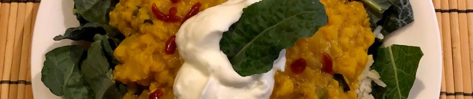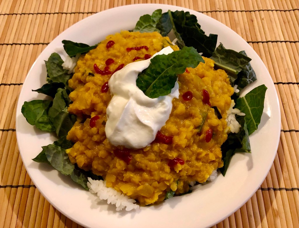 On Friday we used Tuscan kale grown by our daughter in the community garden as a base for our delicious Afghani red lentils. This simple and homey dish cooks in about 15 minutes and is tasty and nutritious. I garnished mine with a dollop of non-fat Greek yogurt and sriracha but to keep it vegan skip the yogurt.