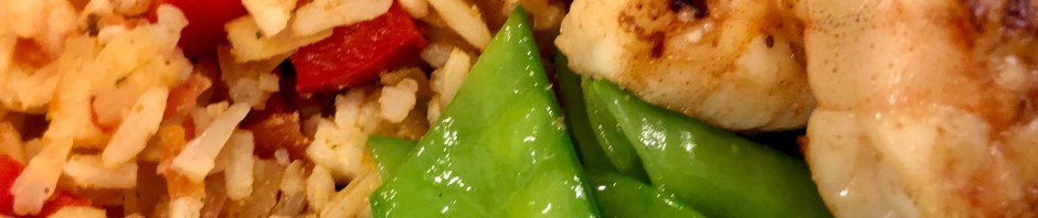Since Saturday dinner is usually leftovers I used our leftover rice from Friday and stretched it by adding an equal amount of cauliflower rice and then enhancing it with red bell pepper, onions, garlic, jalapeño, and a little spicy salsa. It turned out really well and tasted mostly like rice and less like cauliflower. John cooked the shrimp in a lightly oiled pan for 3 minutes on the first side and then turned the heat to low and cooked the other side for around 2 minutes. It is important not to overcook your shrimp! While he was spending 5 minutes cooking the shrimp I took care of the snow peas. I cooked them briefly in a smidge of butter and a little water, covered for the first two minutes and then uncovered for the other three.
