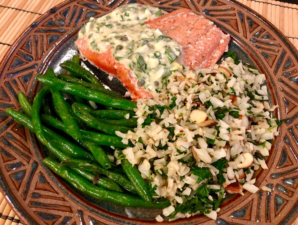 John used his start-in-a-cold-pan-after-brining technique for the salmon. It is supposed to eliminate the albumin from seeping out. It worked on John’s piece but not on mine so the salmon is not as pretty as it might be. I made a sauce Grabiche to go with it. It is supposed to be an oil and Dijon mustard based sauce but I used light mayonnaise instead of oil because I could control the calories better with it. There are also capers, cornichons, tarragon, vinegar, and parsley in it. It also features a chopped up hard boiled egg.