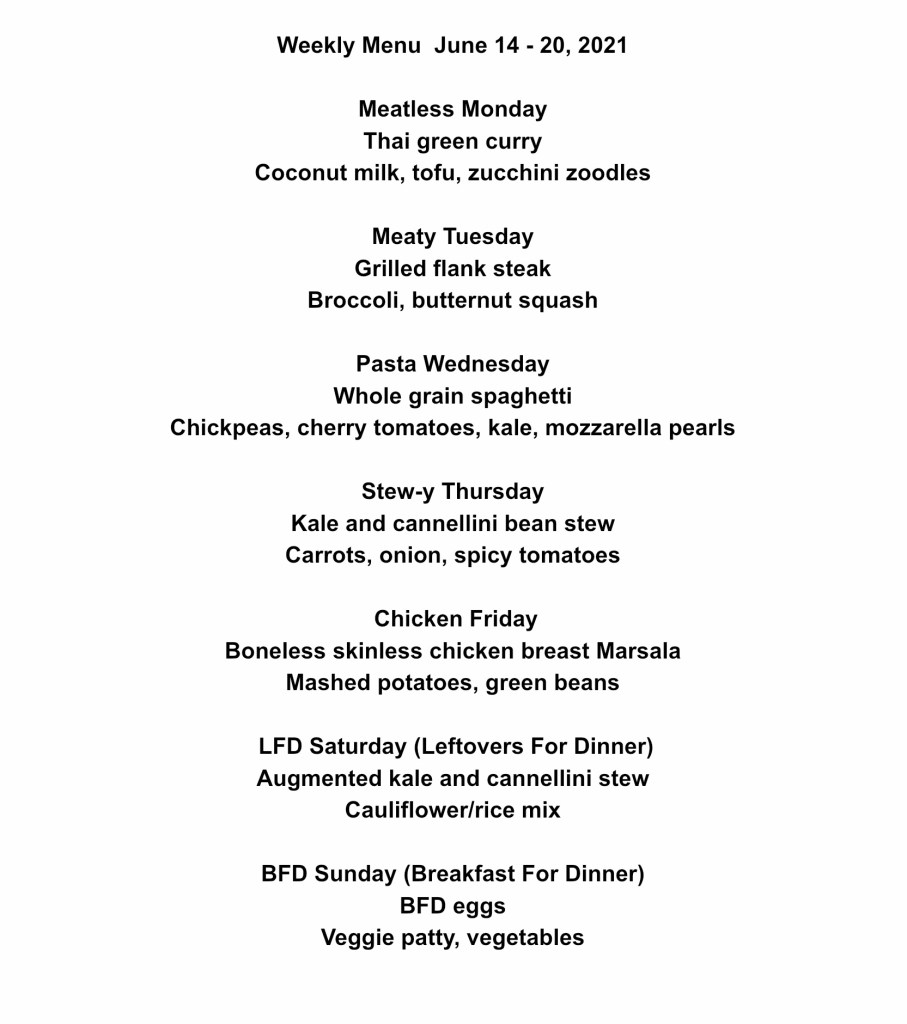 We are trying a recipe from the show, The Kitchen, that we saw last week. It is for a Thai green curry using zucchini zoodles. We are substituting tofu for meatballs. It should be interesting. Otherwise, the week is pretty standard except for the lack of fish or shellfish.