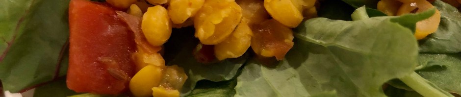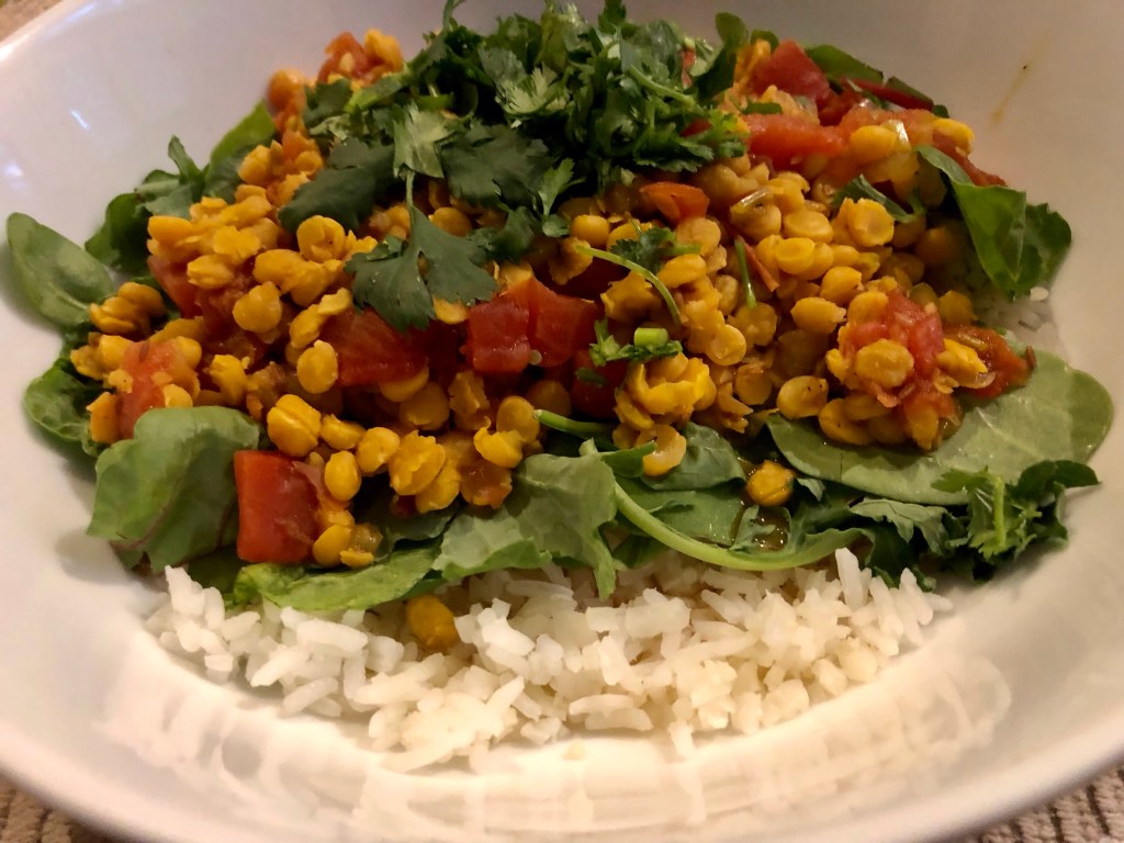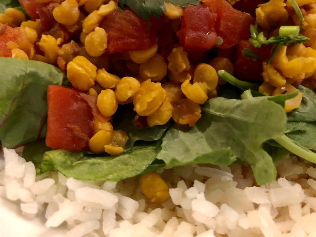 We make our Chana dal in our Instant Pot. It cooks at high pressure for 15 minutes and the steam is released after a 10 minute cool down. It is garnished with lime juice and cilantro. John made some white rice and I heated up some cauliflower rice. I find a 50/50 combination has the rice still tasting like rice and not cauliflower. For convenience sake I used a bag of baby greens to wilt on top of the rice and under the Chana dal.