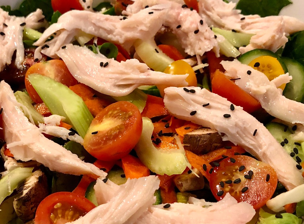 I decided to make a salad tonight rather than the planned eggs. John opted for a bowl of cereal. I finished up the last of a bag of carrots and stalk of celery as well as making a significant dent in my lettuces. I find salads quite boring so the more I put in one the more interesting it is to me. I dressed my salad with an Asian style dressing which was left over from Monday’s zoodles fiasco.