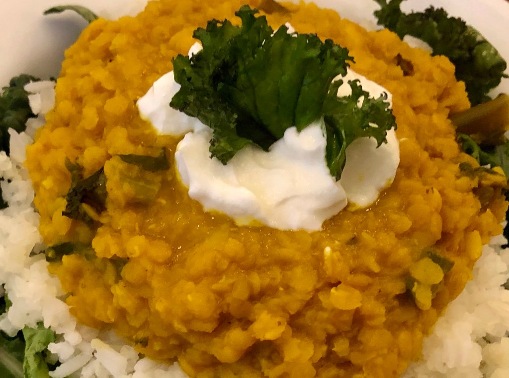 I know it is hardly the sundae you were looking for but this is a delicious vegetarian (or vegan minus the yogurt) dish that is super healthy, tasty, and pretty to look at. I first had this red lentil stew at a restaurant nearby and was blown away with how delicious it was. I was determined to make it for us at home. I found a recipe on an Afghani recipes site and adapted it for our use.