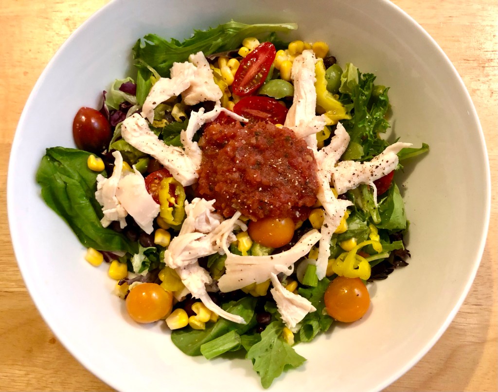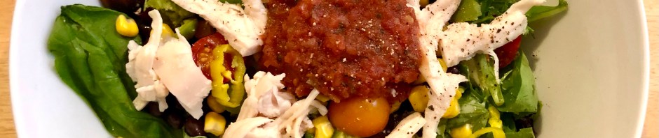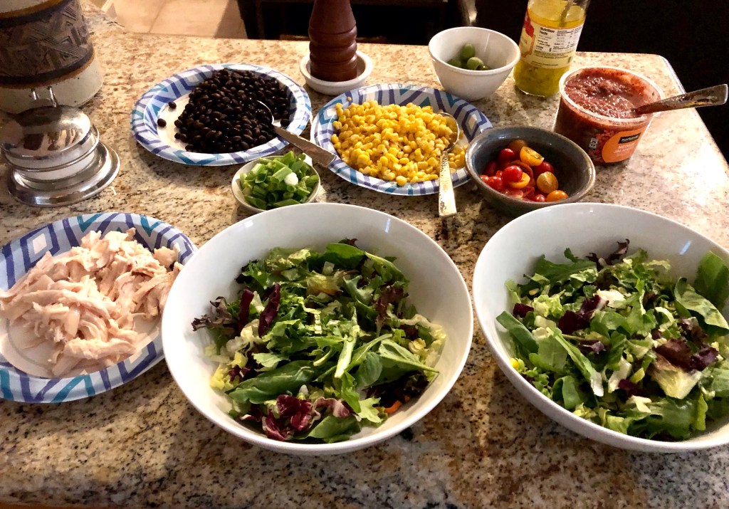 When it is too hot to cook the best thing to do is to have an assembled dinner. Since it was around 104F yesterday, we decided on a Southwest chicken salad. We set up the ingredients on the kitchen island and each of made our own salad.
