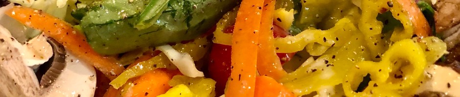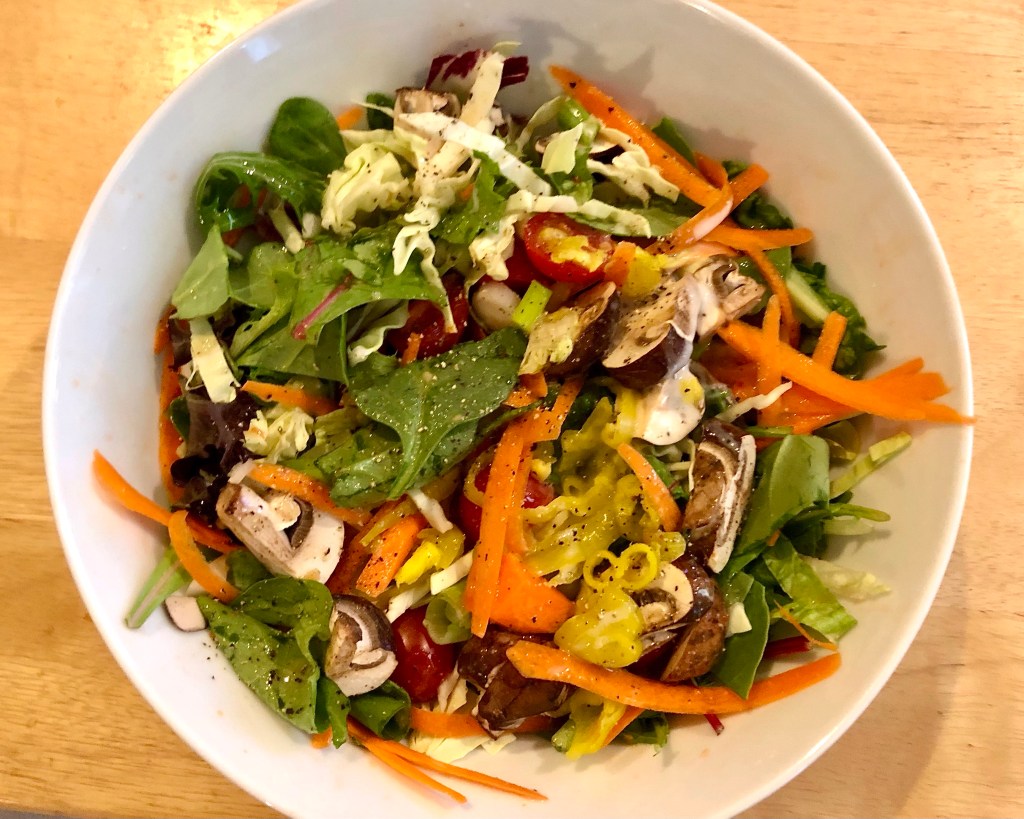 As a first course on Monday we started out with a tossed green salad with lots of extras. Mushrooms, carrots, cabbage, cherry tomatoes, and some spicy pepperoncini gave interest and texture to the salad. John complimented me on the salad saying that anytime someone else makes the salad it is especially good.