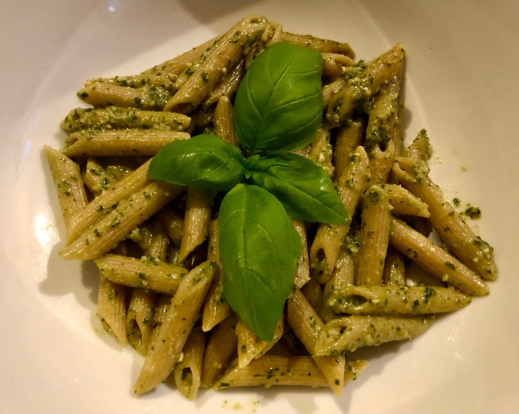 For our main course we had whole grain penne which was mixed with the pesto I made last week. It was sooo good. I froze the rest of the pesto and will use it the next time we have pasta. I think I’ll eat very carefully that day so I can have another ounce of pasta!