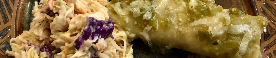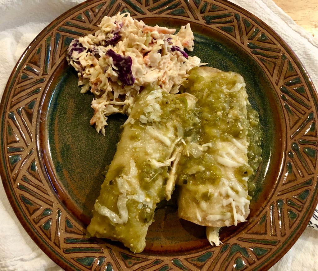 This dinner can be made easily using some convenience products. John shredded some rotisserie chicken while I sautéed onions, garlic, and chopped jalapeño peppers. I combined the chicken with the veg and added some jarred salsa verde and shredded cheese. John cooked the tortillas in a little spray until they were pliable and I rolled them around the chicken mixture. They went into a baking dish that had a coating of salsa verde on the bottom. A little more salsa verde on the top and a sprinkling of shredded cheese and they were ready to go in a 375F oven for 15 minutes.