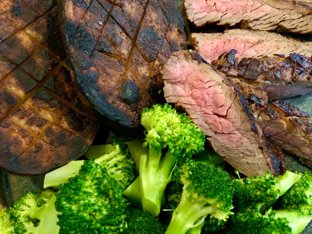 Looks like we are in for a hot week so grilling outside keeps the kitchen cool. John cooked the flank steak to medium and it was very tasty. I actually cooked the potatoes in the microwave first and then handed them off to John to get a little char on them for extra flavor. I cooked the broccoli in a little water and a little butter. This is a really quick and easy dinner that satisfied my craving for some meat!