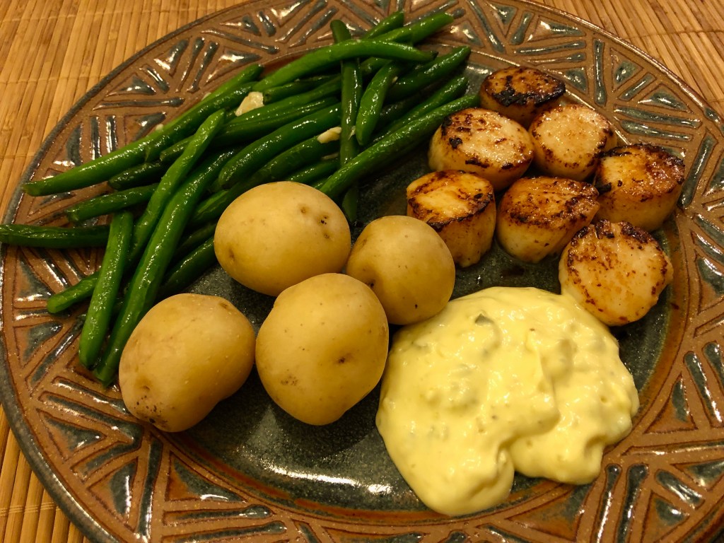 Friday night’s dinner is pretty straight-forward although any dinner that includes scallops is pretty special. John does such a good job cooking them especially since we are not quite so strict on how much fat can go into the pan anymore. For my part I steamed the potatoes and sautéed the green beans with some garlic, I also made the tartar sauce which, to be honest, is good on the potatoes and the green beans as well as the scallops.
