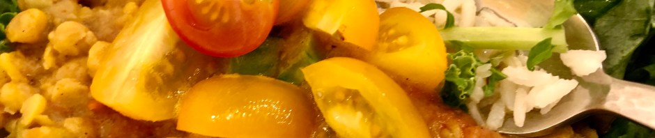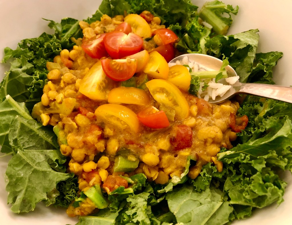 Our Leftovers For Dinner (LFD) were a replay of July 22nd’s Chana dal. We had made a double portion and froze half so all we needed 0to do was defrost the container, cook some new rice, and lay down a bed of kale from a pre-packaged bag.To add more freshness I broke off the fat stems of the kale and added them to the stew and cut up a bunch of cherry tomatoes to garnish my dish.