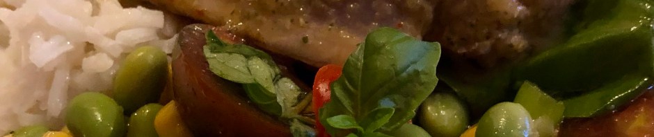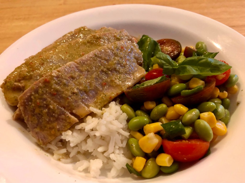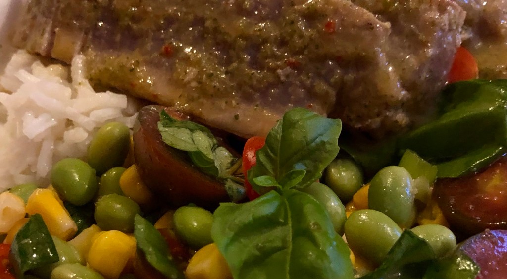 I made a salad of edamame, corn, tomatoes, and basil with a little oil, a few drops of sesame oil, and red wine vinegar. It turned out well. John also made some rice to go along with the rest of the dinner.