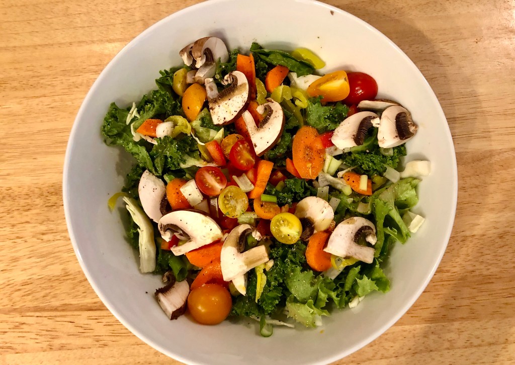 Since I knew that the amount of pasta we were preparing would not fill us up, I made a large salad for each of us. I think I have mentioned many times before that I do not really like salad much especially I have to make it myself. In fact John mentioned last night that a good salad is one that someone else makes. But our salads were bright and colorful with lots of additional items. They were the perfect addition to our meal.