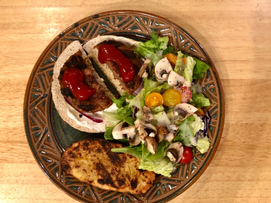 Today’s hot weather dinner was another foray into plant-based burgers. Last week we tried Morningstar’s Incogmeato and our reaction was meh. The Beyond Meat burger was better especially if you like well-done burgers. For those of us who like our hamburgers medium rare it was less successful. John said he still would prefer a real meat burger and I still prefer a veggie burger that tastes like vegetables.