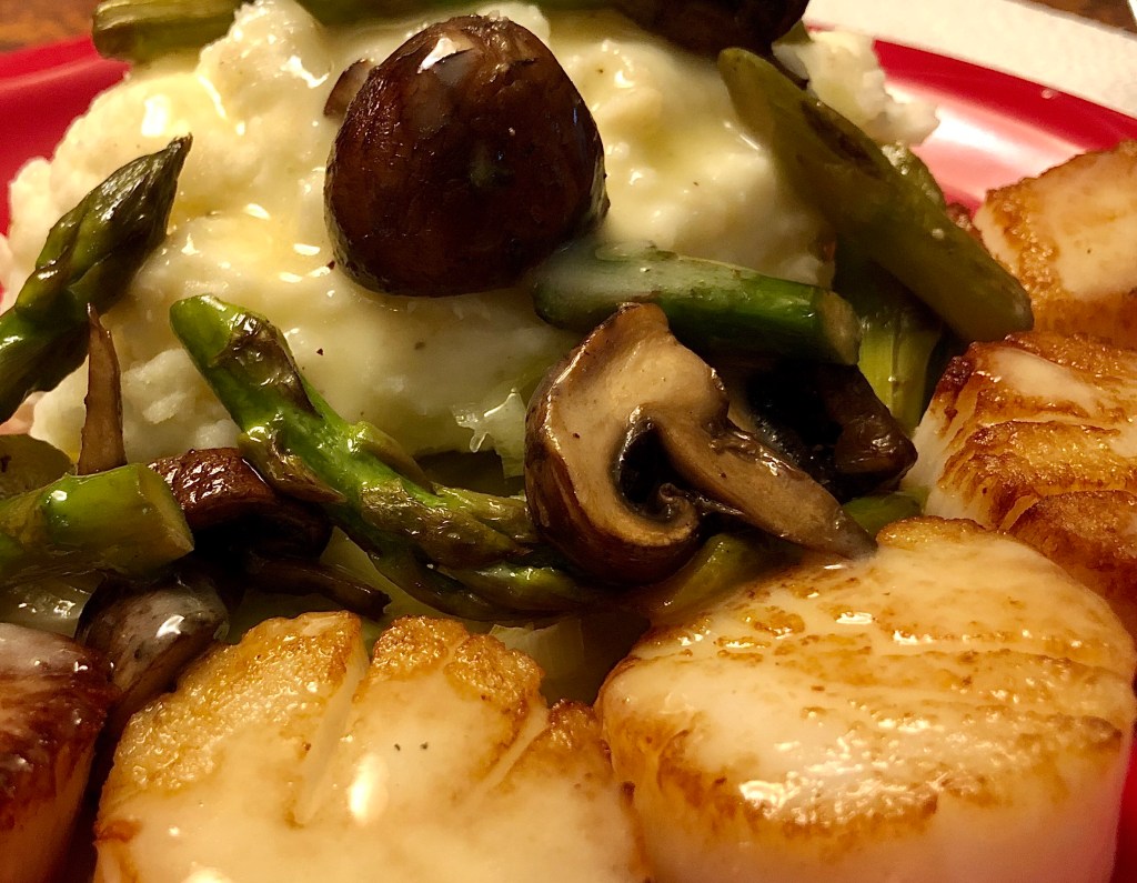 This restaurant quality dinner was made by our son for us on the next to last day of our vacation. It was superb! My only contribution was to peel the potatoes and cut up the vegetables. He calls this his fancy dinner which he makes for special occasions such as his wife’s birthday or Valentine’s Day. It is his adaptation of Chef Joey Altman’s scallop dish from the now defunct Oak City Grill in Menlo Park, CA. I loved the butter braised leeks especially. The scallops which we got at the local Harmon’s grocery were large and succulent. He cooked them perfectly using a Thermopen to make sure they were not over cooked (110F in the interior.) The butter sauce had a hint of sweetness from white balsamic vinegar rather than lemon. What a fantastic dinner!
