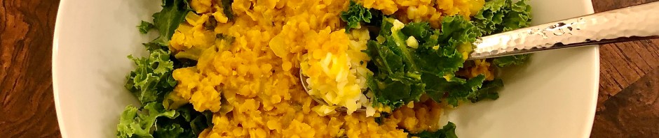 Red lentils cook pretty quickly in some stock that has been flavored with cumin seed, salt, onion, garlic and ginger. I serve them over raw kale with a base of white rice and cauliflower rice mix.