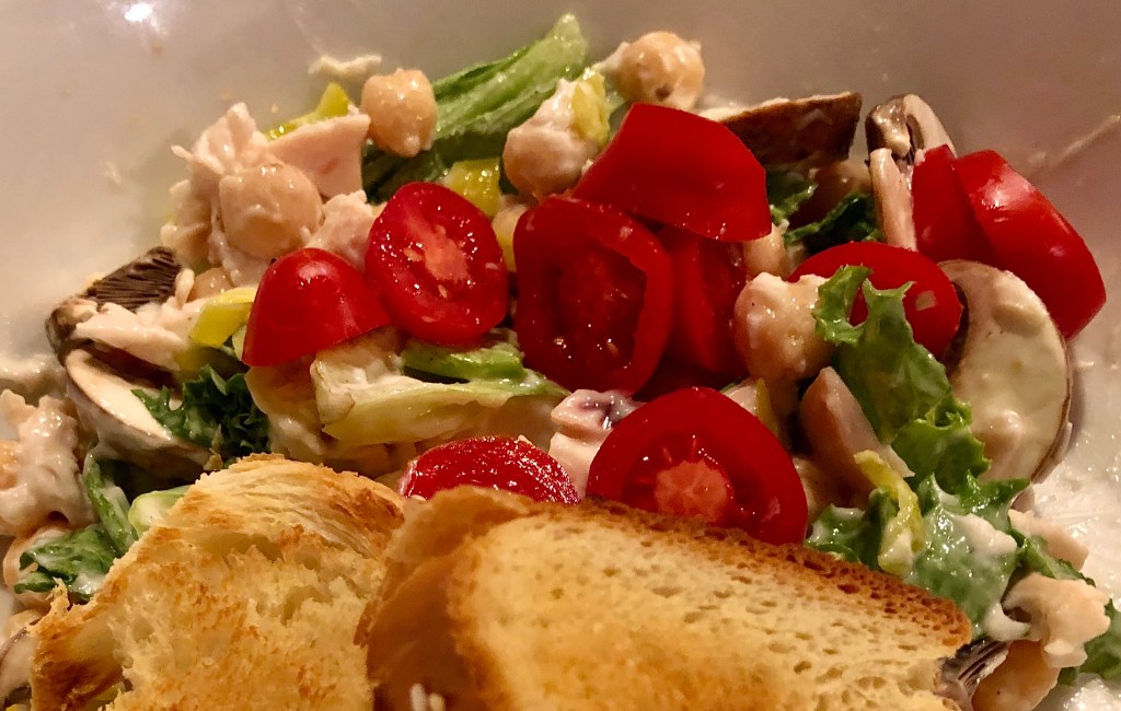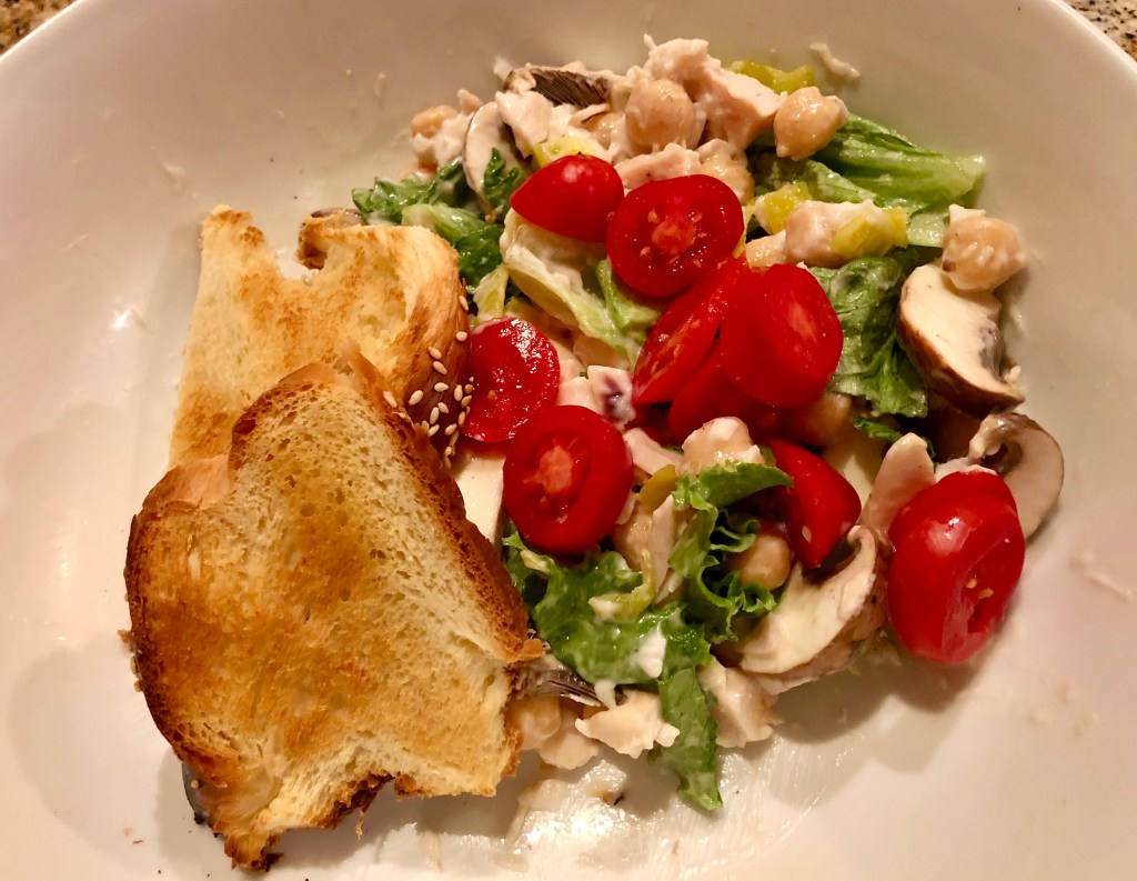 On Tuesday we ended up eating a cold plate of leftover flank steak, a microwaved leftover baked potato, and some leftover lentils and rice. On Wednesday I took some cold rotisserie chicken and combined it with chickpeas, light mayonnaise, and pepperoncini. This combo was pretty tasty with Roma tomatoes and slices of toasted challah.