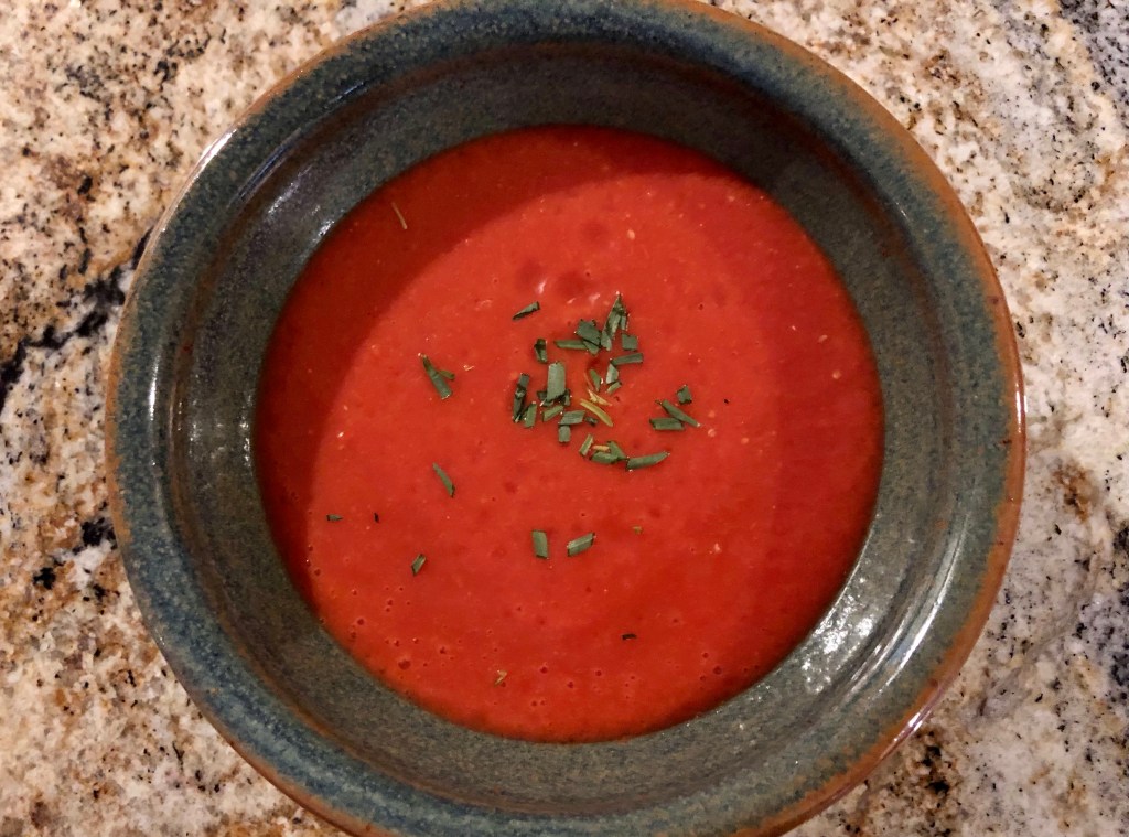 Making gazpacho is as easy as putting a bunch of vegetables in the blender and letting it rip. In addition to the 2 pounds of tomatoes I added a can of Rotel spicy tomatoes, some onion, garlic, white wine vinegar, a good glug of olive oil, and plenty of salt. I don’t even strain it. Putting the blender on liquify for a few minutes does a good enough job on the tomato skins. Anyway, some fiber is good for us.