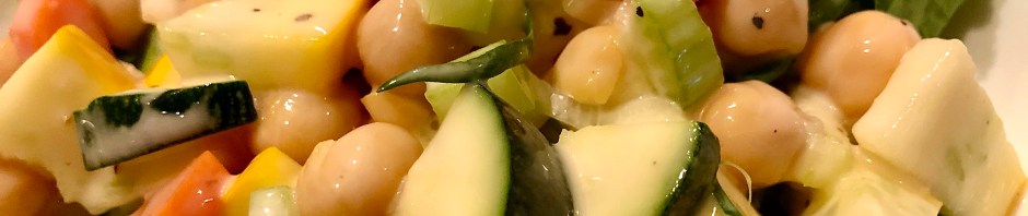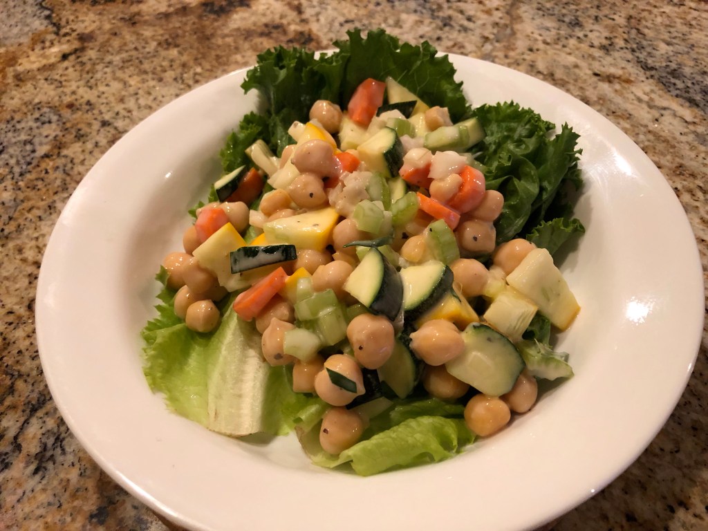 Since I figured we would still be hungry after the gazpacho, I made a salad with chickpeas, carrots, onion, celery, yellow and green summer squash, and tarragon on top of some lettuce leaves. The dressing is a couple of tablespoons of light mayonnaise and a tablespoon of Skinny Girl ranch dressing.