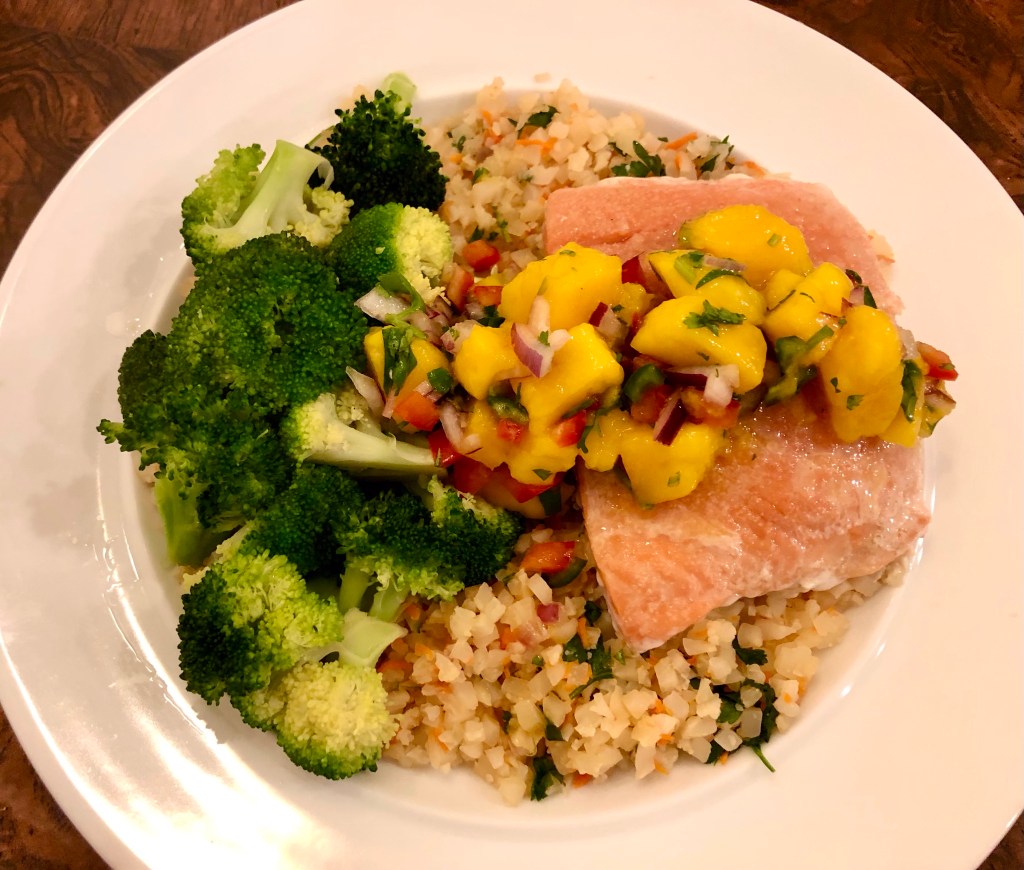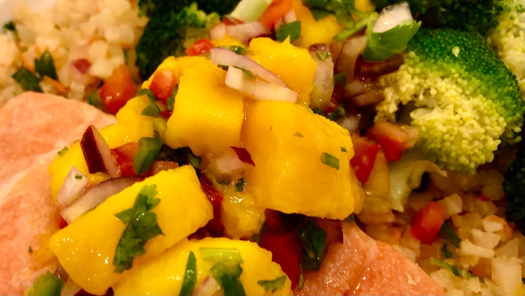 While I liked everything in tonight’s dinner I really think that the mango salsa was the star. Mangoes are so sweet and delicious! They pair especially well with cut up red onion, red bell pepper, jalapeño, cilantro, and lime juice. A little salt really perks the whole salsa up. I have found that a couple of days in a paper bag with an apple helps to ripen the mango. I use the peeling technique where you slide a piece of mango over the edge of a glass. The peel stay in your hand and the flesh falls into the glass. Try looking up “peel a mango with a glass” on Google and you will see several video choices showing you how it is done.