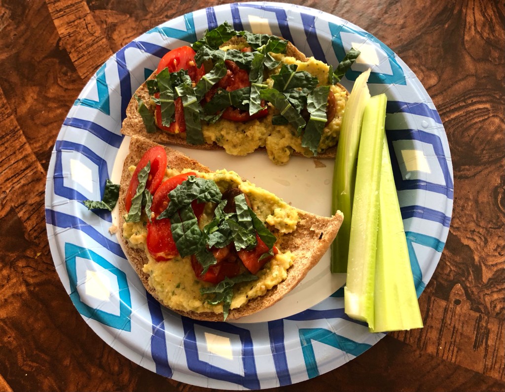 This is my first healthy-eating, post-vacation lunch. In addition to the chickpea spread, my sandwich includes half of a pita divided into two thin half-round pieces, home grown tomatoes, kale, and celery sticks. I also had an apple for dessert. It tasted terrific and made me feel good about myself.