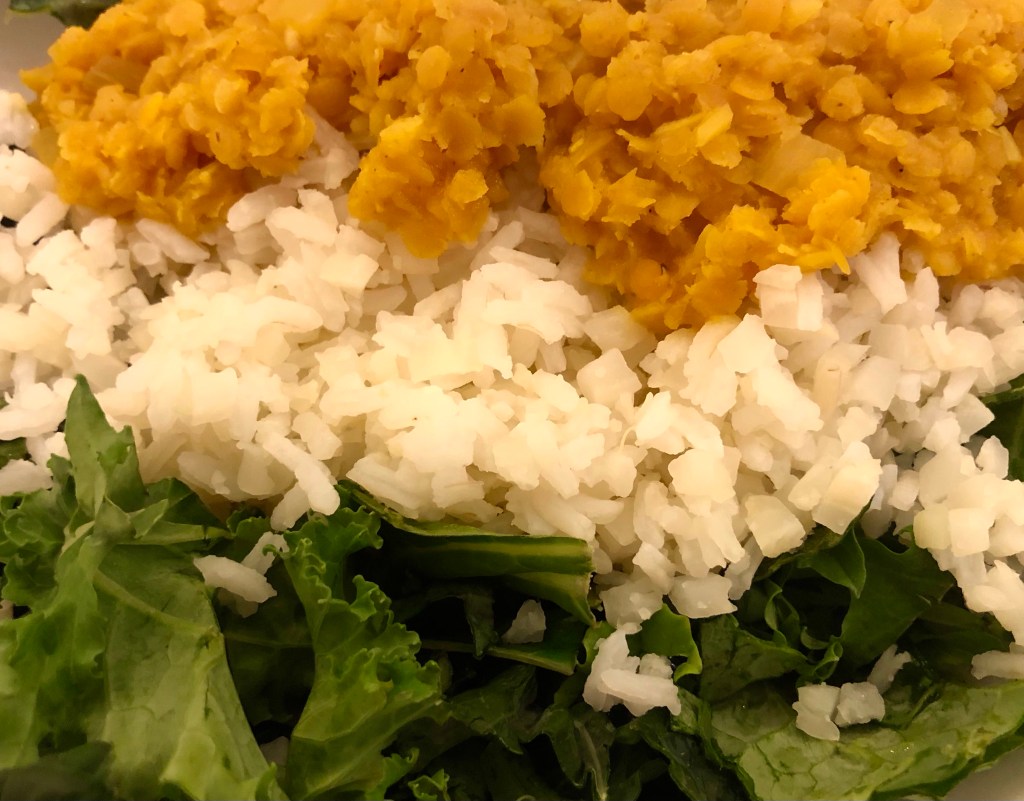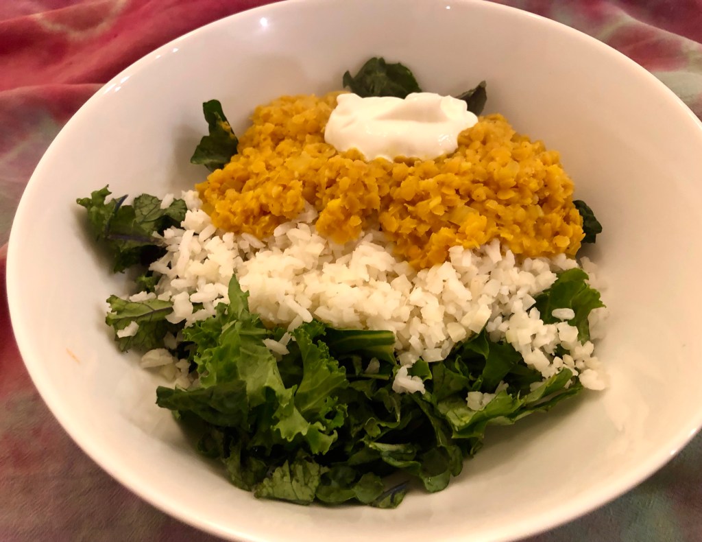 I served the lentils over a bed of raw rainbow kale and a 50/50 mix of white rice and cauliflower rice. I also added an optional dollop of plain yogurt and a squirt of sriracha.