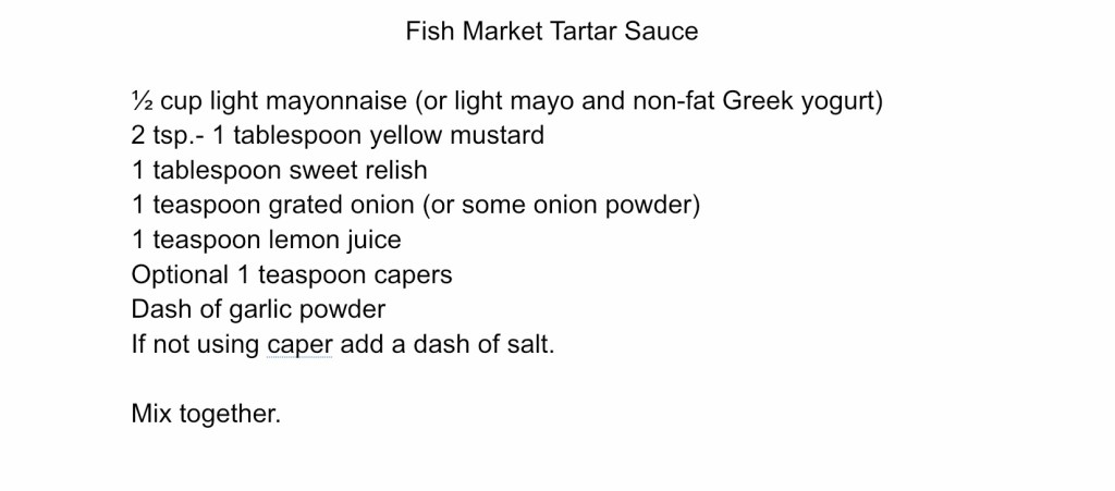 The tartar sauce is a recipe that I asked for and received from the Fish Market, a seafood restaurant out here on the West Coast. We have always loved their tartar sauce. The secret is yellow mustard. They only gave me the ingredients, not the amounts of each ingredient. So the recipe below is my approximation.