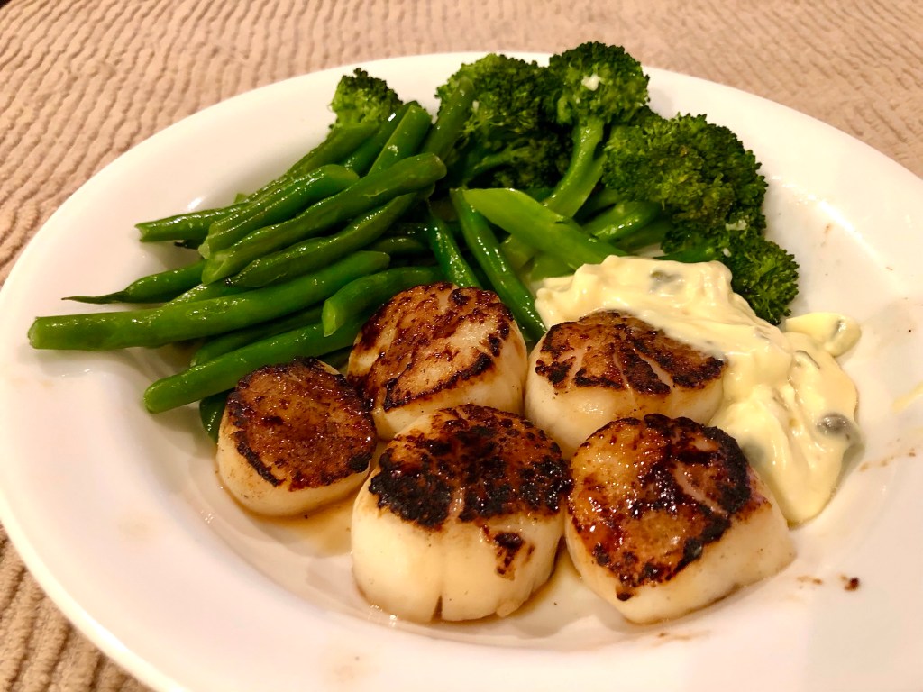 Having scallops for dinner always seems like a special occasion. In fact we opened a nice bottle of Chardonnay to drink with it. Due to the wine drinking, I decided to forego the new potatoes and make myself a double vegetable plate. John and our daughter went with the original concept.