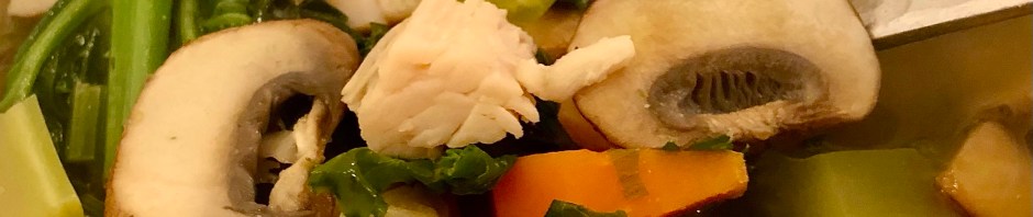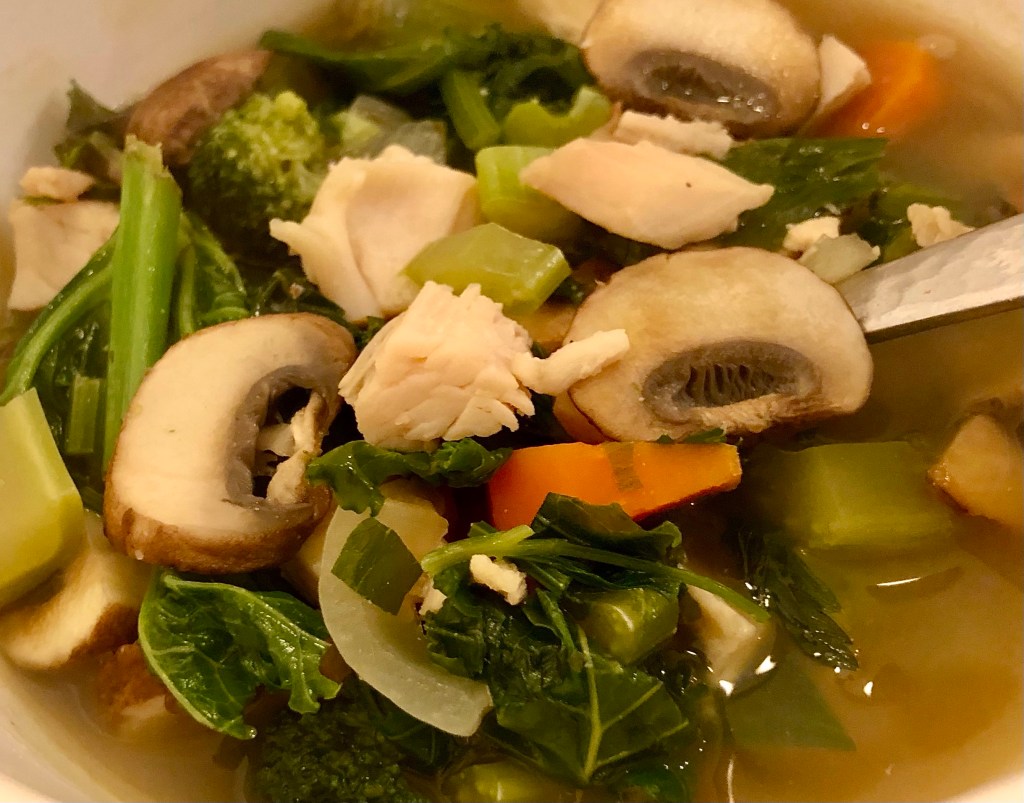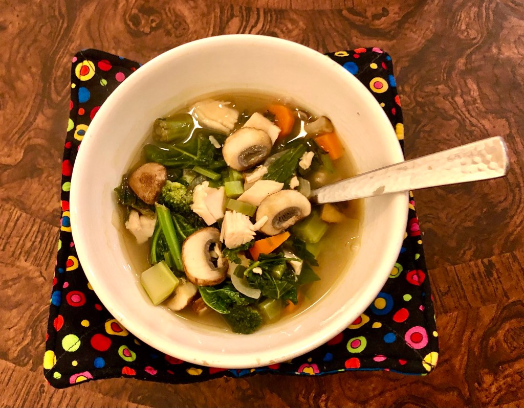 This soup starts by sautéing onions, mushrooms, and garlic in olive oil spray. From that point on I add the broth and the vegetables according to hardness— carrots, kale stems, celery, and broccoli. In the last minutes I add the leafy greens and my pre-cooked chicken. Obviously this could be turned into a vegetarian/vegan dish by omitting the chicken and using vegetable stock.
