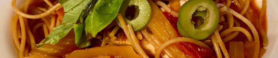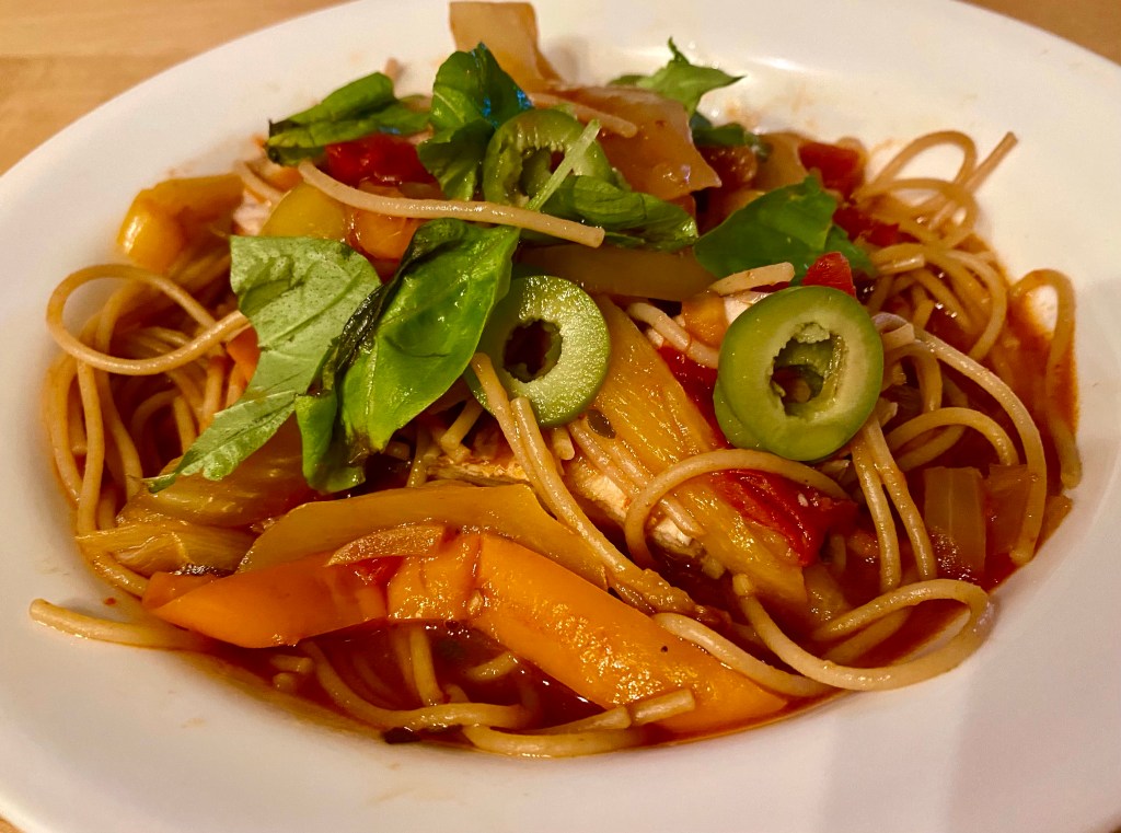 John put a bunch of oil and parmesan cheese on his which helped. If you are planning on making this dish just follow the recipe. Back in my “before” days, I made this chicken cacciatore using the actual recipe. It turned out much better.