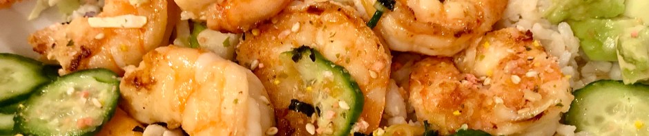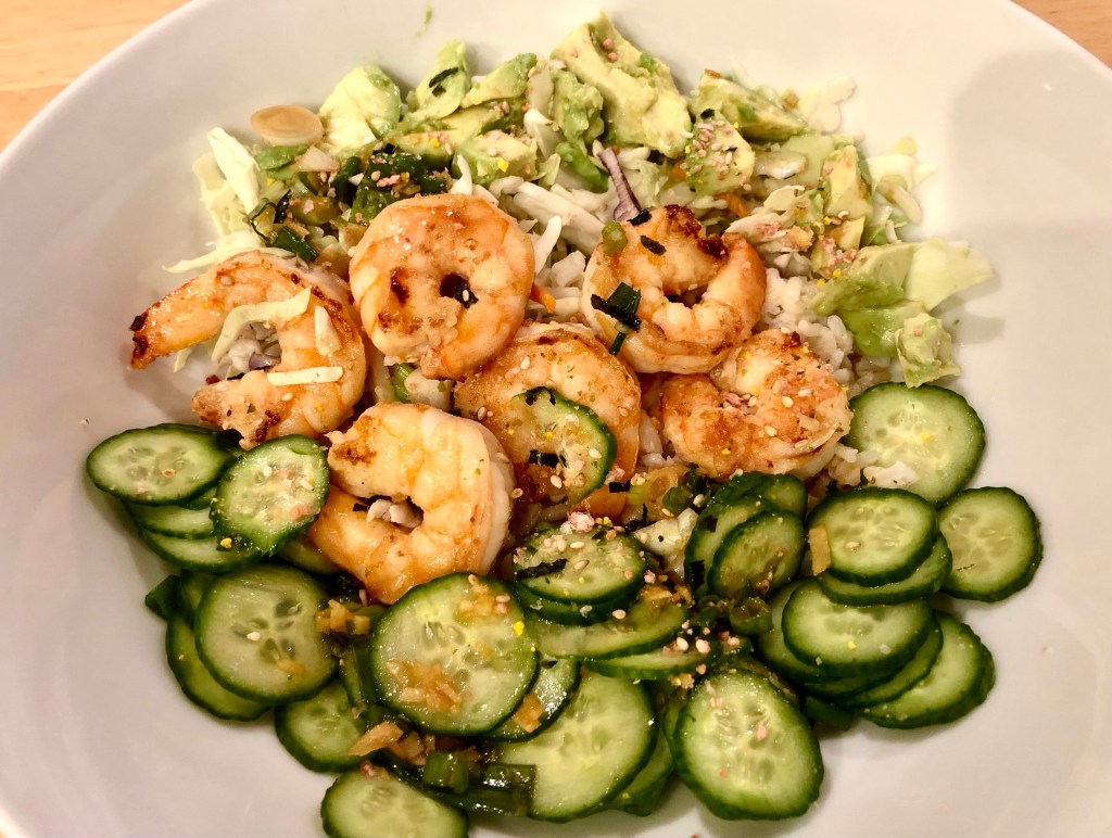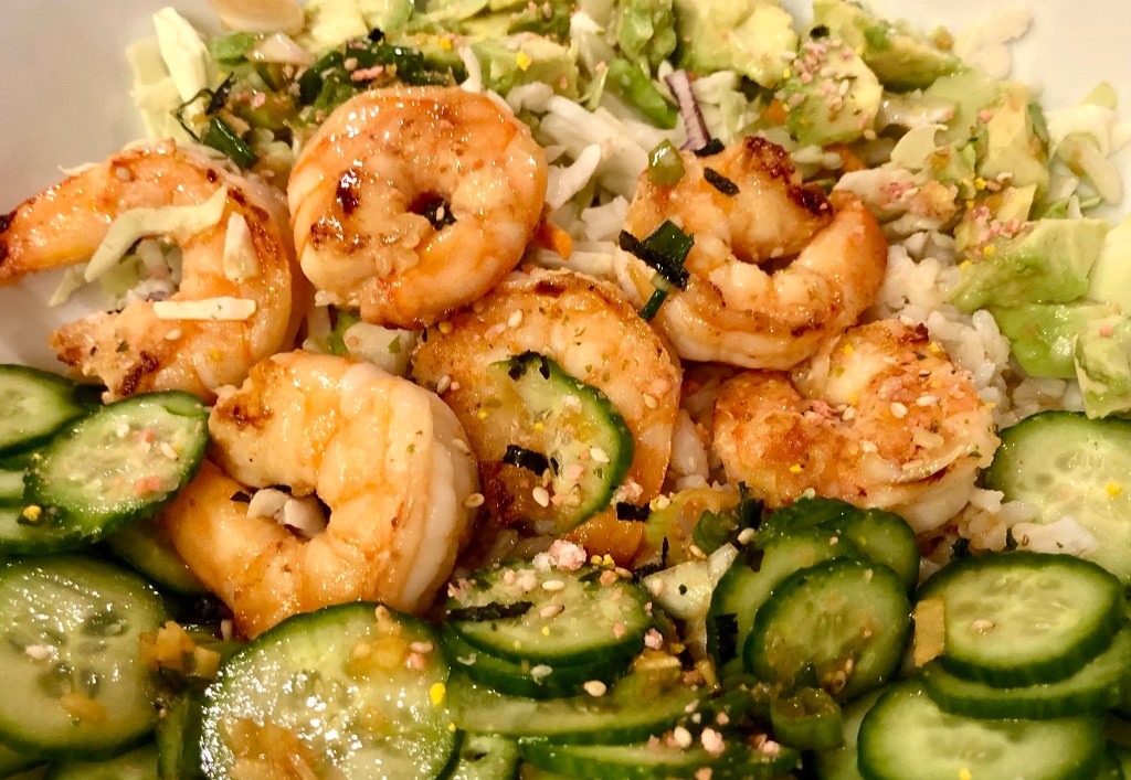 Now cook the shrimp quickly and put it on top of the rice followed by the cucumbers, avocado, and cabbage. Ladle some of the sauce over everything and dust with sesame seeds or my favorite, furikake.