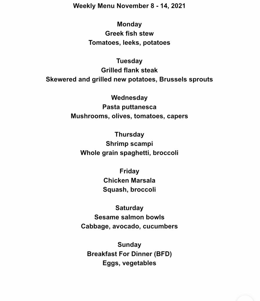 This week’s menu has a carry-over from last week. We were supposed to be making the Greek fish stew last Thursday but something came up and we ended up with take-out. We will have it on Monday this week instead. This week has 3 seafood meals, 2 vegetarian, 1 chicken, and 1 red meat meal.