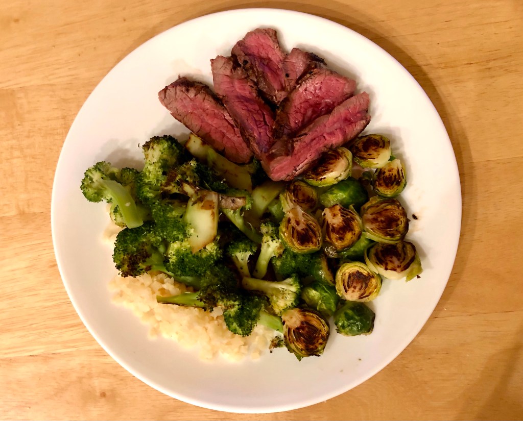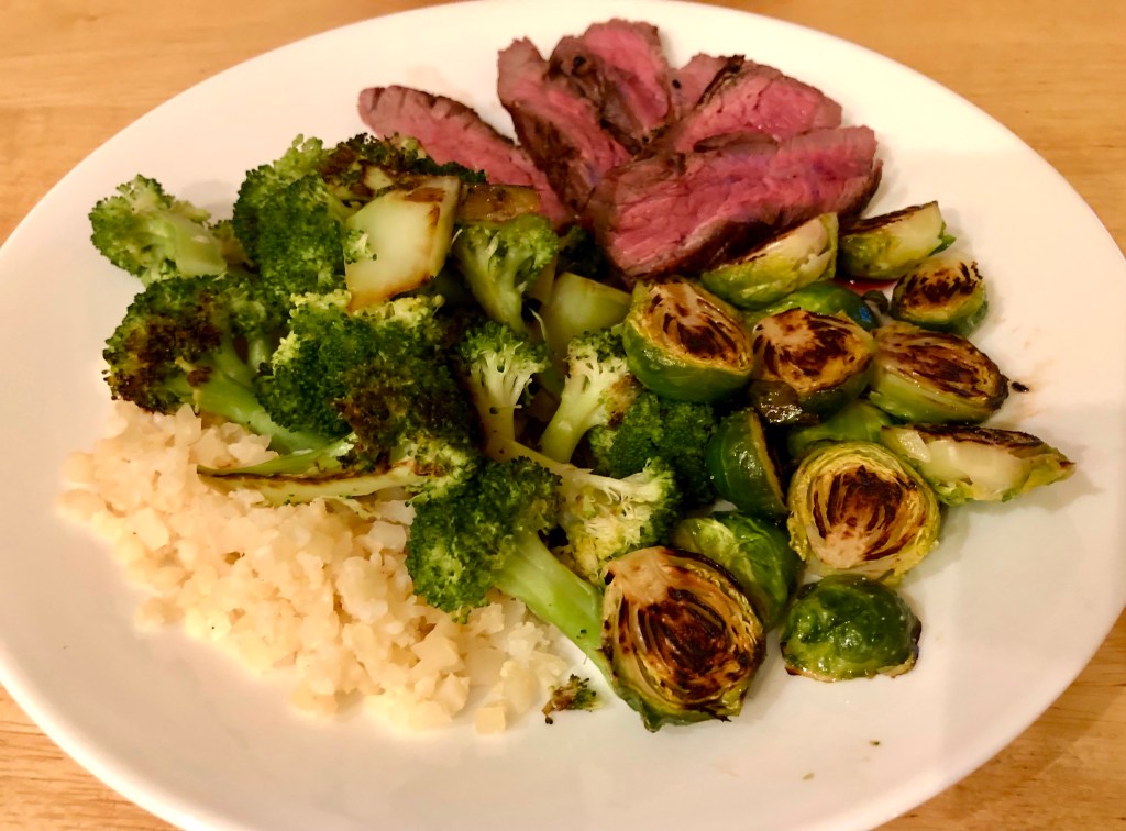 The hardest part of this dinner is to get all the veg and the steak finished cooking at the same time. I often overestimate how long the grilling will take and end up with underdone vegetables. Tonight I started the Brussel sprouts ahead of John’s grilling of the steak which gave them time to get brown. The broccoli almost got burnt because I was paying too much attention to the sprouts! And the cauliflower rice was just an easy warm up in the microwave.