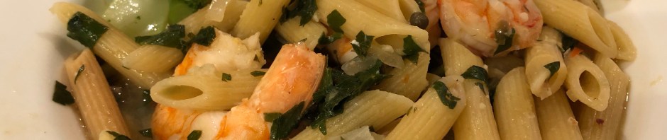 What makes this shrimp scampi slimmed down? For one thing the sauce uses only 2 teaspoons of olive oil for two servings. The rest of the sauce is onions, garlic, chicken stock, white wine, and lemon juice. At the end of the sauce-making I put in a couple of tablespoons of capers, some parsley, and lemon zest. Another reason for its diet friendliness is because there are only 2 ounces of pasta per serving. Finally I am not asking the pasta to do all the work here. I good portion of my plate is covered by broccoli which tastes awfully good in the lemony sauce.