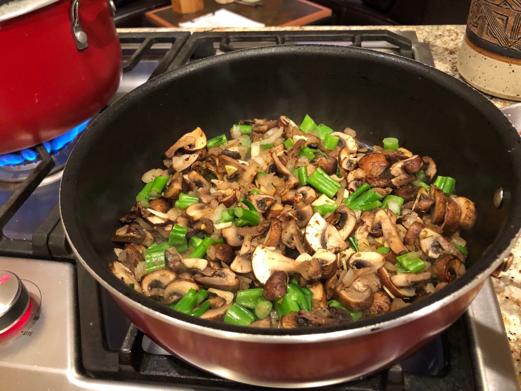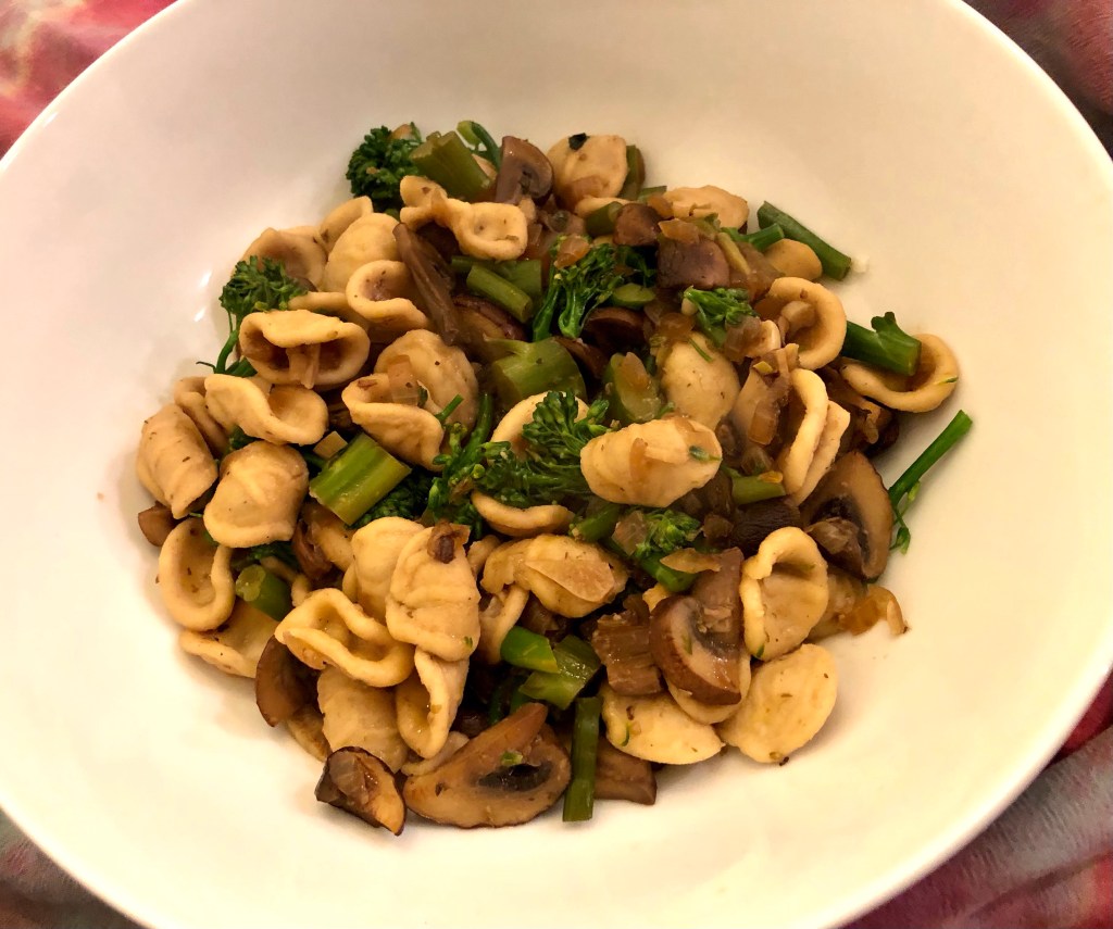 I am about to give up on these whole grain orecchiette imported from Italy that I bought through Amazon. There are no directions on how long to cook them and even at 16 minutes they still seemed doughy! Anyway, here is my process for making pasta with mushrooms and vegetables