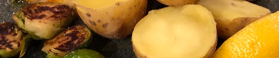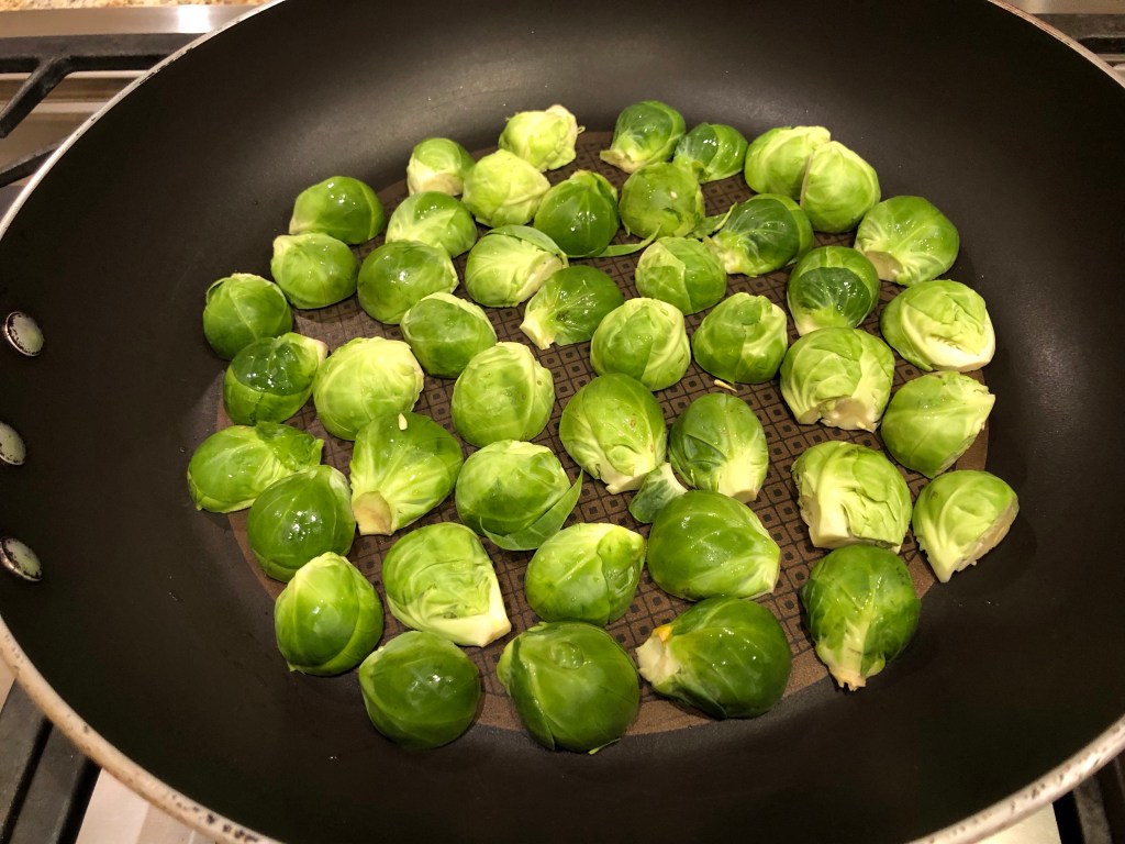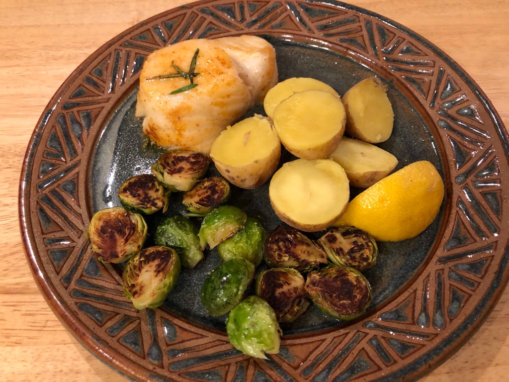 After the potatoes have been on for about 15 minutes I start the Brussels sprouts and John puts the fish in the oven.