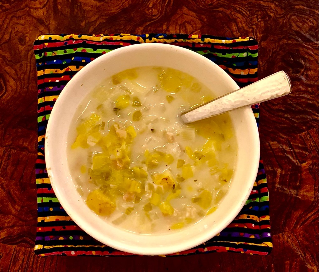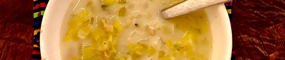 With the exception of cleaning and cutting up the leeks, the rest of making this soup is pretty simple. No doubt I have posted this recipe on my blog several times. Onions, celery, potatoes, leeks, chop, chop, chop. Sauté until limp. Add clam juice and liquid from canned clams and simmer until potatoes are tender. Deglaze with white wine. Add minimal cream and chopped canned clams. Stir and serve with toasted crouton.