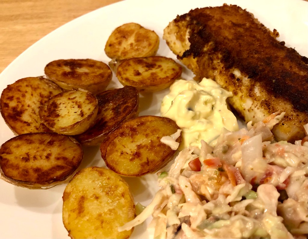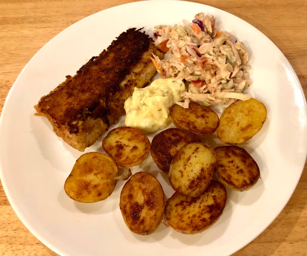 We splurged on a little olive oil tonight to get the crispy texture on the potatoes and fish. John’s method for the mahi mahi is to slather the fish with a combo of light mayo and yellow mustard and then roll the pieces in seasoned breadcrumbs. The fish was fried in a tablespoon of olive oil and some olive oil spray. The exterior came out a little dark but the fish was moist and not overcooked.
