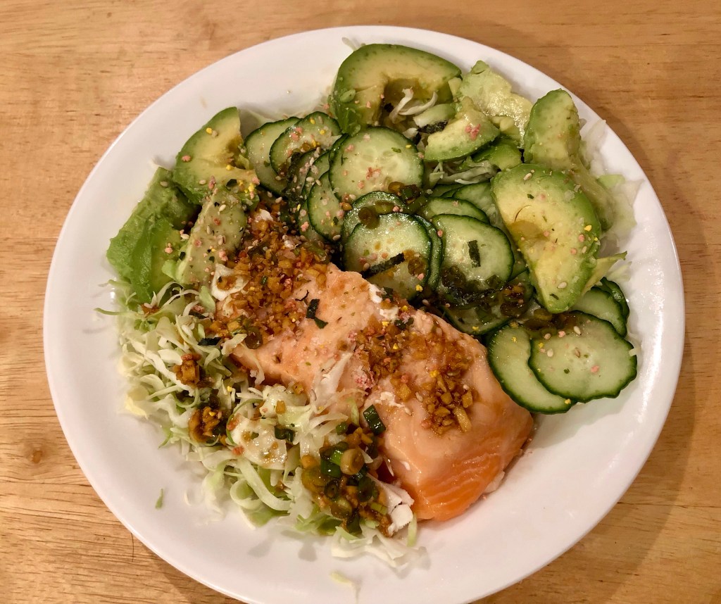 My job is to make the vegetables and dressing. I cut the cucumber on a mandolin and use a package of cabbage slaw. The avocados are simply sliced up but the timing of what day to make the salmon bowls all depends on when the avocado is ripe. If you have a hard one place it in a paper bag with an apple at room temperature and it should ripen in a couple of days.