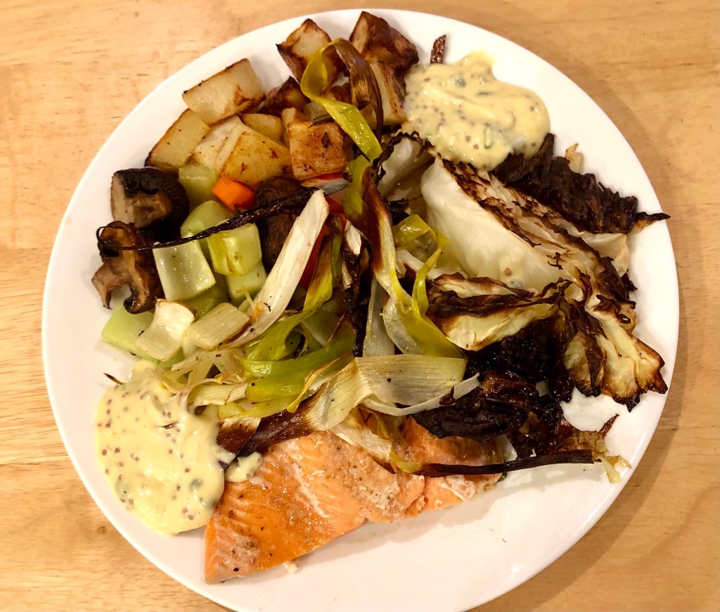 While John was busy brining and cooking the salmon in a dry pan with a light coating of sea salt over a low flame, I cooked a bunch of different vegetables on sheet pans in a 425F oven. First I dropped them in a plastic bag and added olive oil and salt and shook the veg around so that everything got coated. I started with the potatoes and cabbage since they were going to need longer in the oven. After 10 minutes I added another sheet pan of the remaining vegetables.