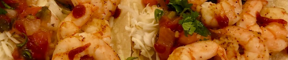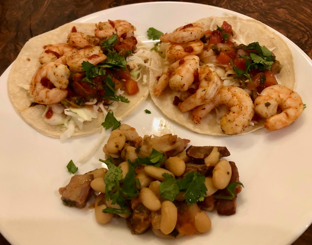 On Christmas Eve we served a platter of shrimp with cocktail sauce and ribs that John had made hors d’oeuvre-accessible by removing the meat that was on the bones so they could be held like lollipops. Not everything got eaten so I needed to craft a dinner out of leftover shrimp and pork. I turned it into shrimp tacos with a side of beans with pork.