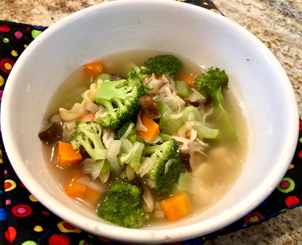 Luckily I have chopped onion left from the tacos Monday night and I have some mushrooms that I can spare from my pasta on Wednesday. I start those in a pot with a little olive oil spray. The carrots, celery, and broccoli are any easy chop from my crudite. Along with some chicken stock they all head for the pot. Then I shred up some chicken and add an ounce of noodles, cook the whole thing for about 10 minutes and I have a delicious, warming bowl of soup.