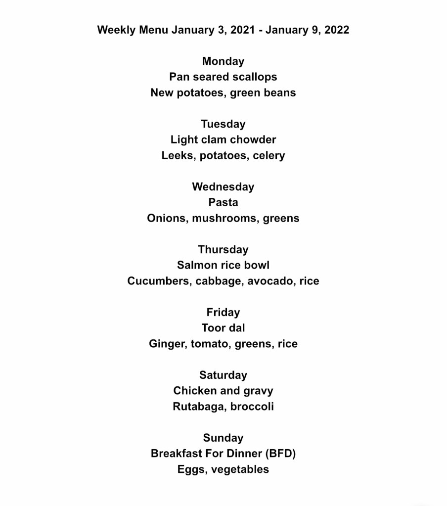 Getting back to basics this week. It is definitely time to stop celebrating. Thanksgiving, my birthday, Hanukkah, Christmas, and New Year’s have taken its toll. This week’s menu consists of three vegan/vegetarian meals, three seafood meals, and one chicken meal. I hope this helps with your menu planning!