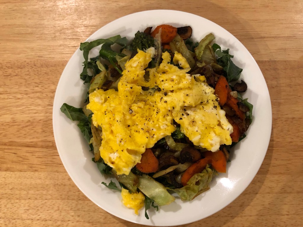 Since I did not want my dinner full of gritty, raw curry powder I took the time to bloom the spice in a little olive oil. In addition to the raw kale which I used as my bottom layer, I stir-fried onion, carrot, cabbage, broccolini, and mushrooms. I put the hot vegetables on top of the kale to wilt it a bit while I soft-scrambled a couple of eggs.