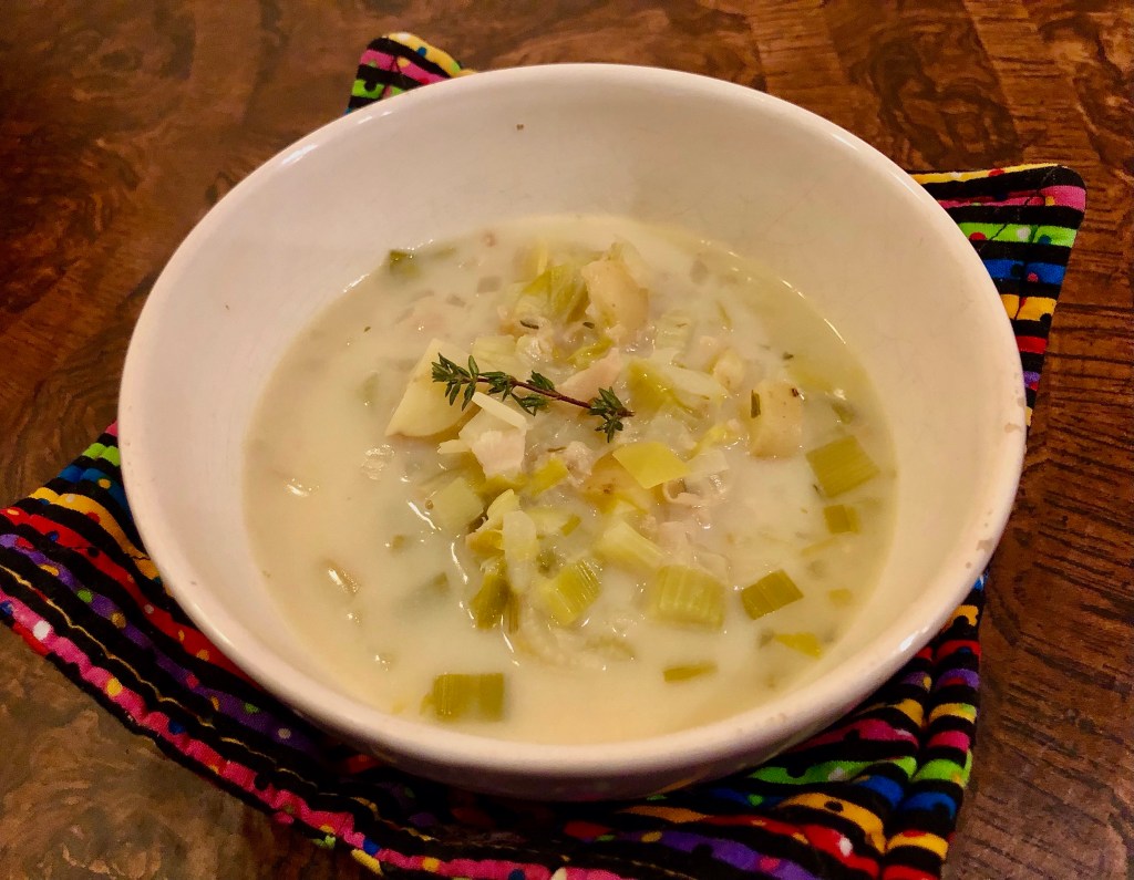 Winter seems like the perfect time for hearty soups. I love clam chowder but not all the cream! The clam chowder we make gets its liquid from two bottles of clam juice and the liquid from two cans of minced clams. At the end of cooking only 2 tablespoons of heavy cream are added for creaminess. It is packed full of celery, leeks, and onions and has only 10 oz. of potatoes. John and I can split the whole pot and not feel guilty afterwards.