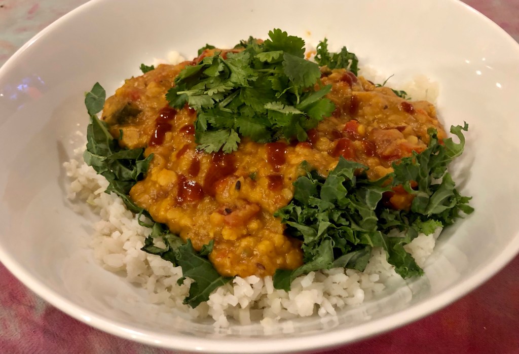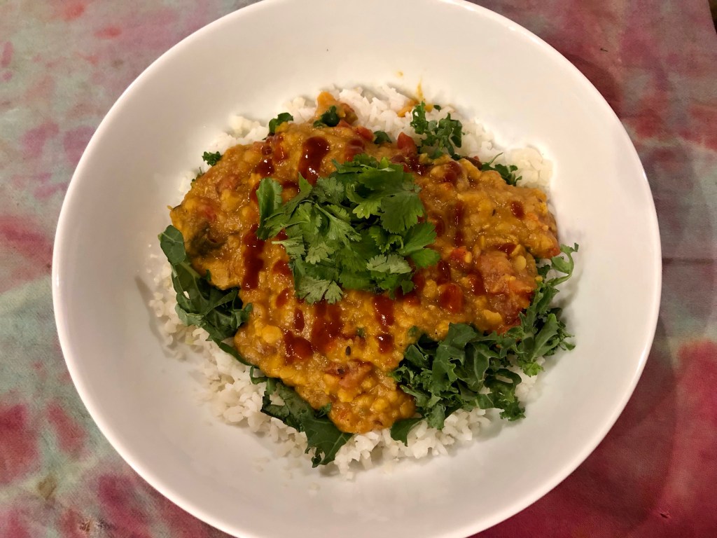 After recooking the whole thing again and letting it sit for a while it was much, much better. The pigeon peas will never be as tasty as the Chana dal but with our additions and a squirt of sriracha we have concocted a dish which we can make again and use up our giant bag of Toor dal.
